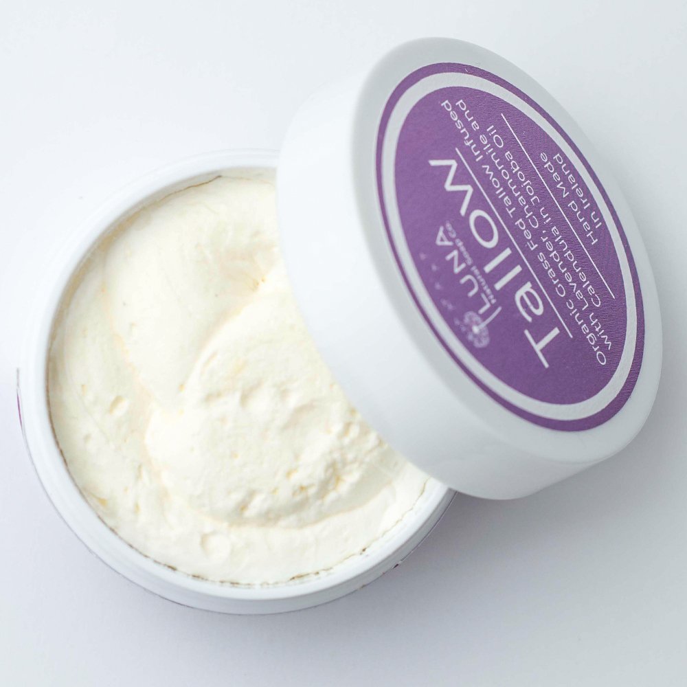Indulge your skin in the soft, cloud-like comfort of our Lavender Whipped Tallow Balm, a deeply nourishing, multi-purpose moisturiser crafted with organic, grass-fed tallow and carefully selected plant oils. Whipped to a light, airy texture, this balm melts effortlessly into the skin, delivering long-lasting hydration while supporting your skin’s natural barrier.